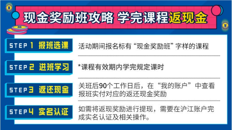 报名本现金奖励班的用户,在班级有效期内(指统一关班前,不包含请假/延期),学完所有主修课件课(学完率需达到100%),并且直播课学完率达到80%,即可得到报名时实付金额20%的返现(实付金额需扣除学习卡、优惠券、折扣、订单立减等优惠,在统一关班后90个工作日之后发放)。如需将返现奖励进行提现,需要在沪江账户完成实名认证及相关操作。点击这里进行实名认证(APP用户请点击我的>我的账户>去实名)。