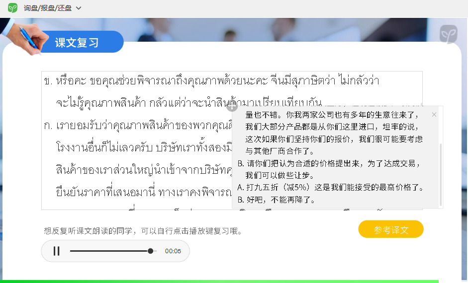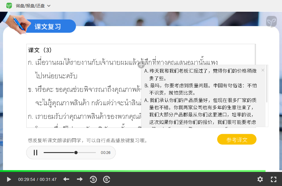 同学你好,该知识点来自沪江网校《泰语零基础直达中高级商务【6月班】》的课程,想要更系统的学习,欢迎进入课程学习。不仅可以和更多的同学一起学习,而且还有老师、助教随时的学习指导和知识点解答哦。