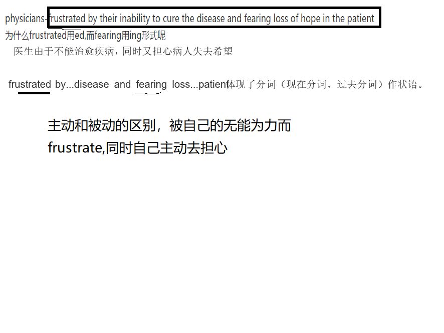 physicians-frustrated by their inability to cure the disease and fearing loss of hope in the patient 为什么frustrated用ed,而fearing用ing形式呢