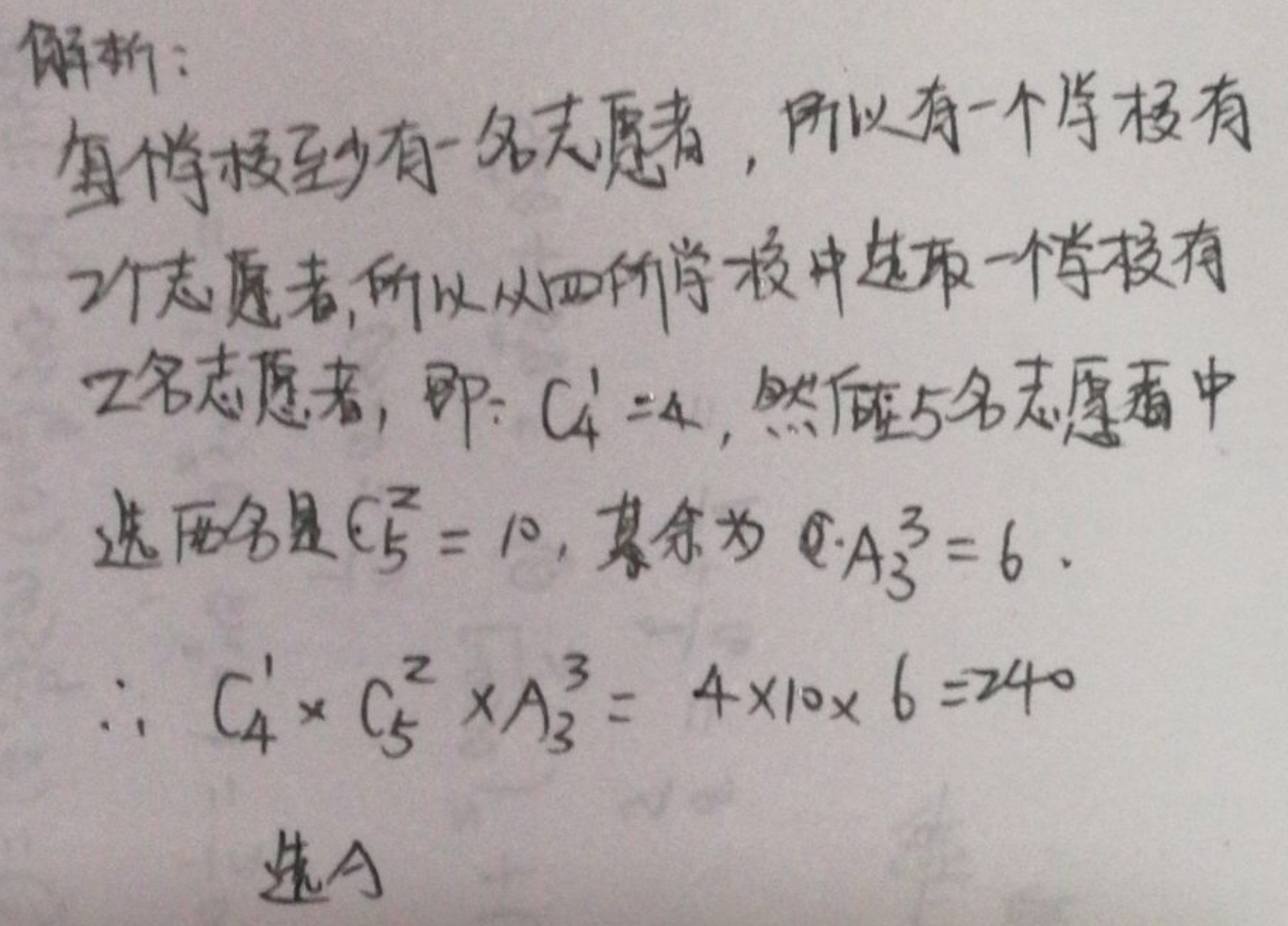 某大学派出5名志愿者到西部4所中学支教,若每所中学至少有一名志愿者,则不同的分配方案共有:
