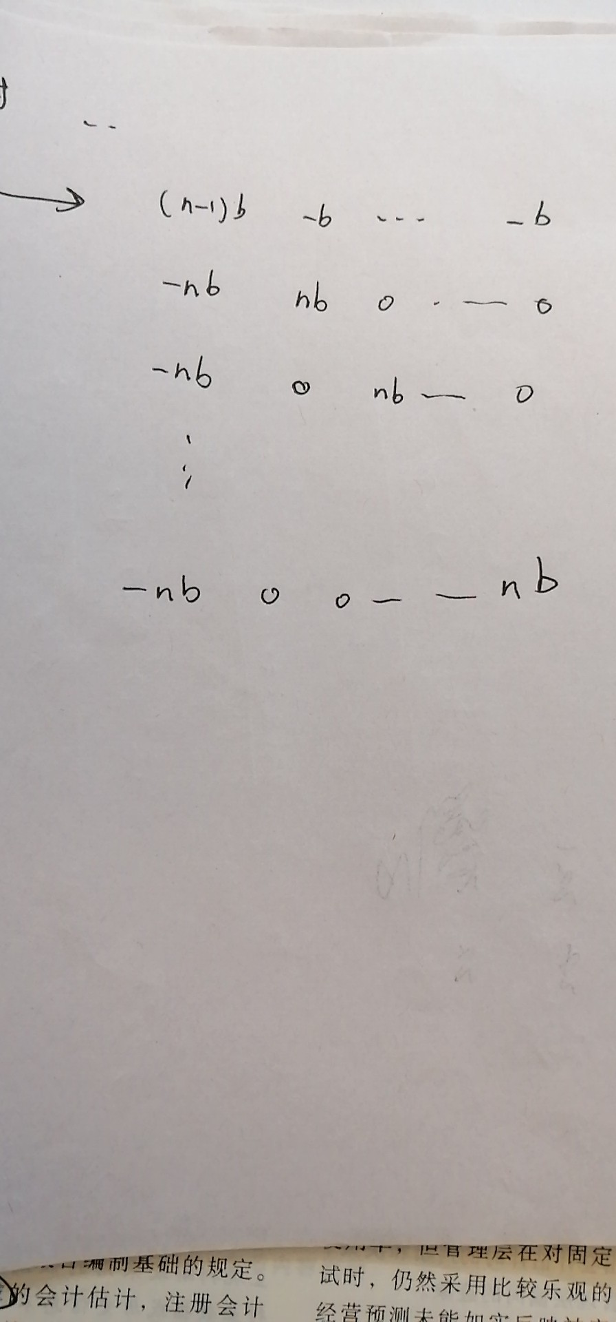 首先我们化简下我们可以判断出来矩阵的秩是n-1,所以基础解系只有一个,我们令x1=1就可以得到,,我们还可以把这个矩阵所有的b都约掉,因为b≠0