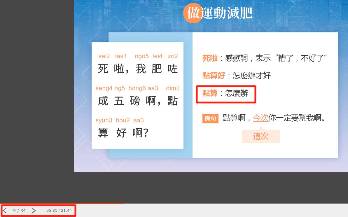 同学你好,该知识点来自沪江网校《港你知粤语入门至初级【随到随学班】》的课程,想要更系统的学习,欢迎进入课程学习。不仅可以和更多的同学一起学习,而且还有老师、助教随时的学习指导和知识点解答哦。