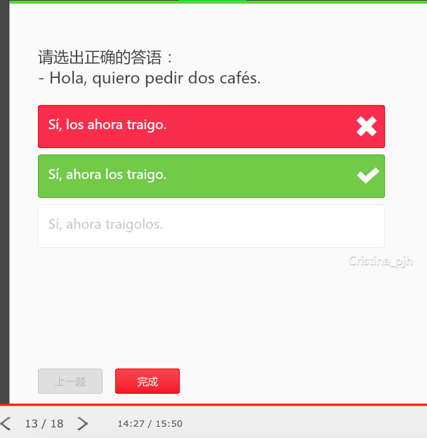 网校学员陆晴安**在学习新版西班牙语零起点0-B2高级直达签约班【2018第4期】时提出了此问题,已有1人帮助了TA。