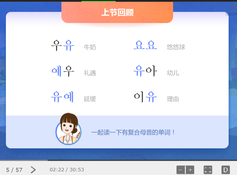 同学你好,该知识点来自沪江网校《跟外教学韩语发音【随到随学班】》的课程,想要更系统的学习,欢迎进入课程学习。不仅可以和更多的同学一起学习,而且还有老师、助教随时的学习指导和知识点解答哦。