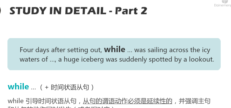 纠错!第10课15:34处“老师说while引导的时间状语从句强调了主句的动作sail和从句的动作be spotted是同时发生的”这里的主句和从句说反了,应该是从句的动作sail和主句的动作bespotted。