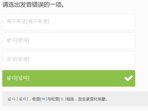 我理解以双音节收音的紧音化现象中,前一个音节仍发代表收音,对吗?比如젊다[점따]。那么,本课小测验第2题中,第4个答案为什么是错的?