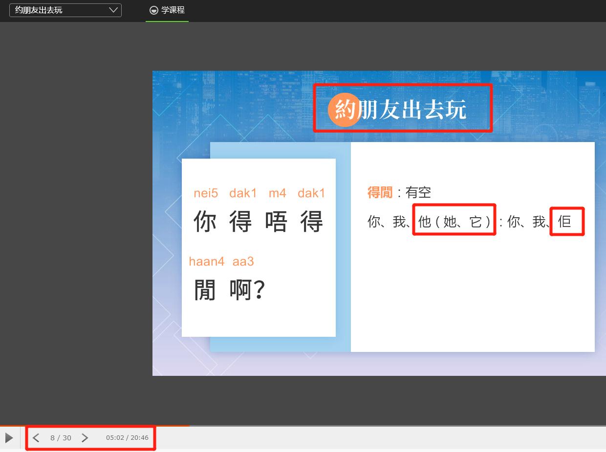 同学你好,该知识点来自沪江网校《港你知粤语入门至初级【随到随学班】》的课程,想要更系统的学习,欢迎进入课程学习。不仅可以和更多的同学一起学习,而且还有老师、助教随时的学习指导和知识点解答哦。