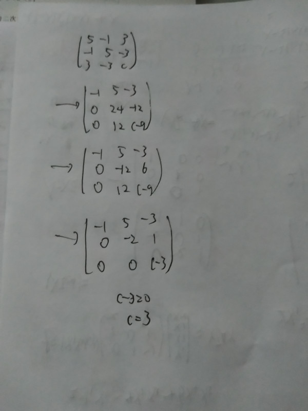 f(x1,x2,x3)的系数矩阵A是个三行三列的,一个三行三列的矩阵的秩是2,也就是说在行变换的时候,有一行绝对全部是0.既然全部是0,那么|A|=0,就可以求出C.或者这样做