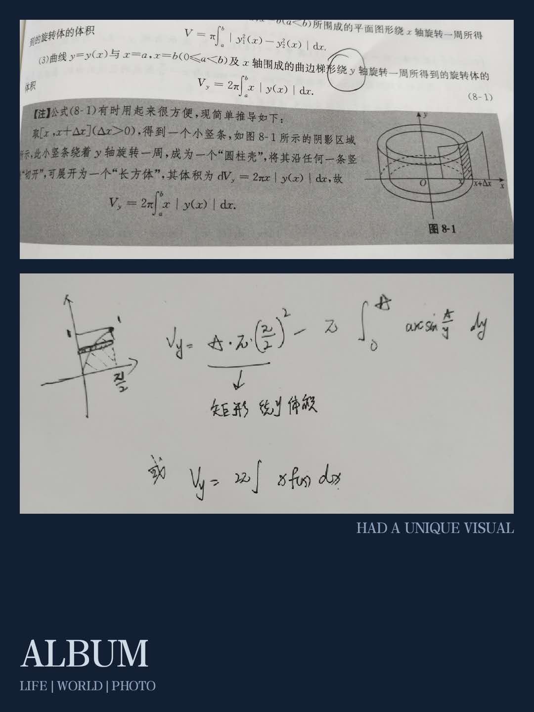 如图,V2绕y轴体积不是应该像我这样算吗(红色笔迹),为什么答案对不上,我错在哪了?答案那个式子怎么推出来的?