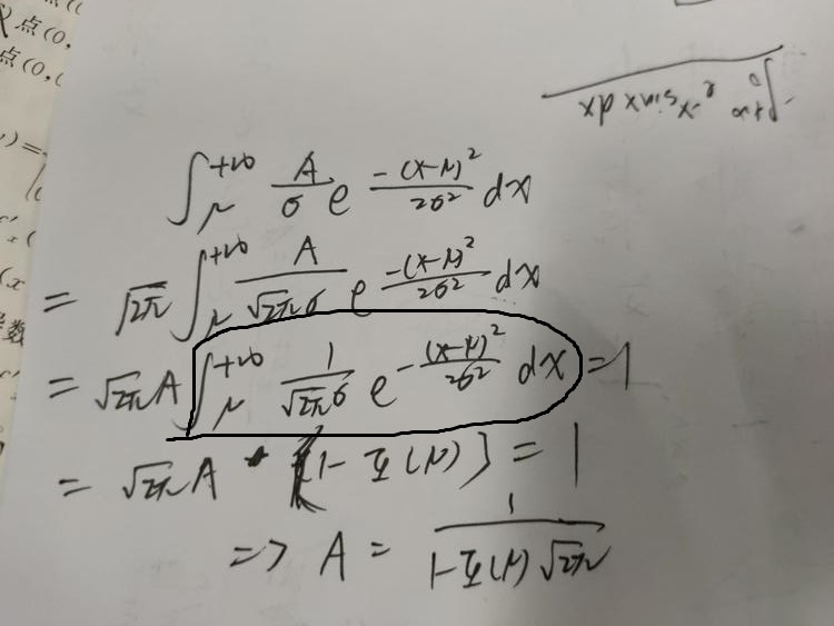 这个地方从正太分布入手,,u就是对称轴了,这样你化简的这一步,,正太分布这里对称轴的右侧,积分结果是1/2了,A可以直接算出来的