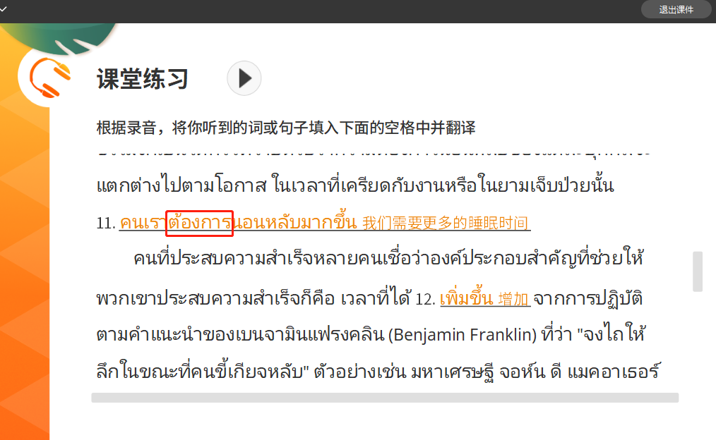 同学你好,该知识点来自沪江网校《中高级泰语【随到随学班】》的课程,想要更系统的学习,欢迎进入课程学习。不仅可以和更多的同学一起学习,而且还有老师、助教随时的学习指导和知识点解答哦。