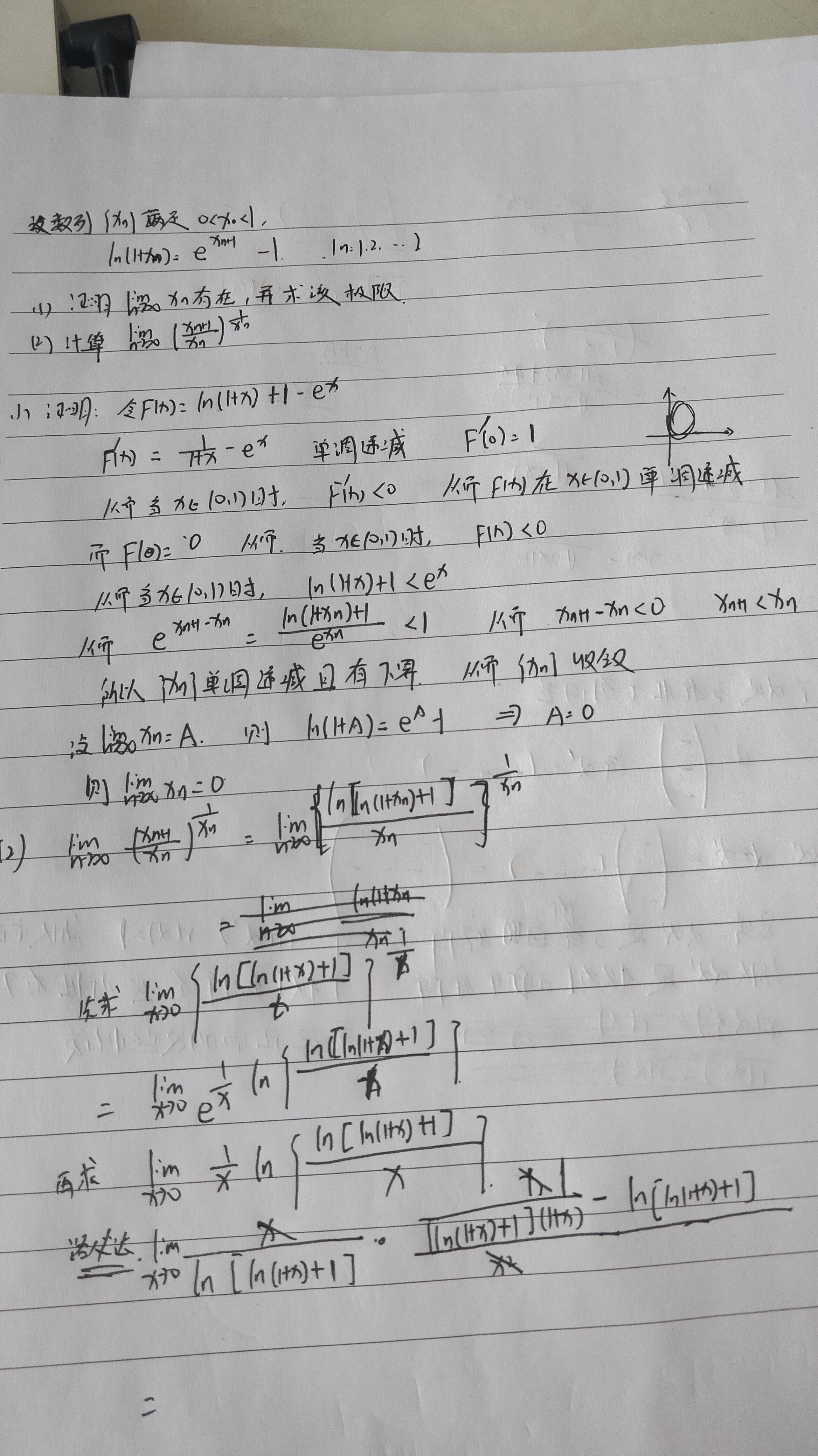 设数列{xn}满足0<x<1,ln(1+xn)=e^(x n+1)-1(n=1,2,......)
