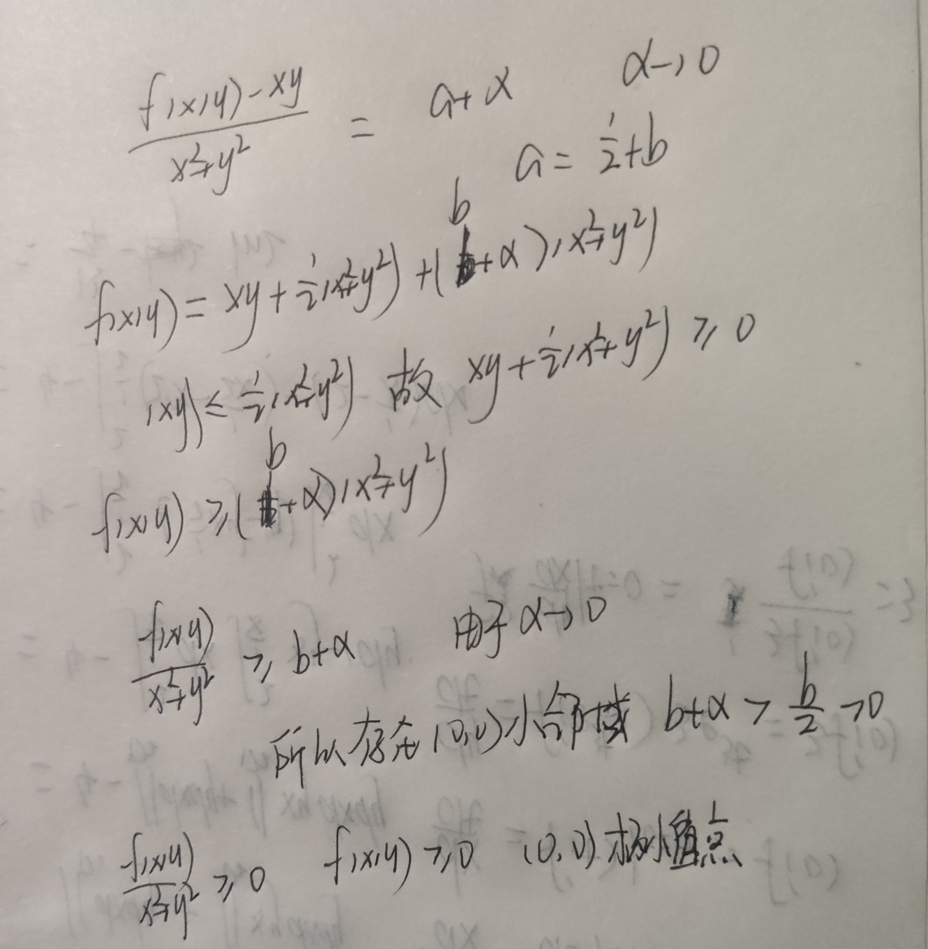 设f(x,y)在点(0,0)的某邻域内连续,且lim (x,y)→(0,0) [f(x,y)-xy]/(x²+y²)=a,常数a>½,试讨论f(0,0)是否为f(x,y)第二件极值,是极大值还是极小值?