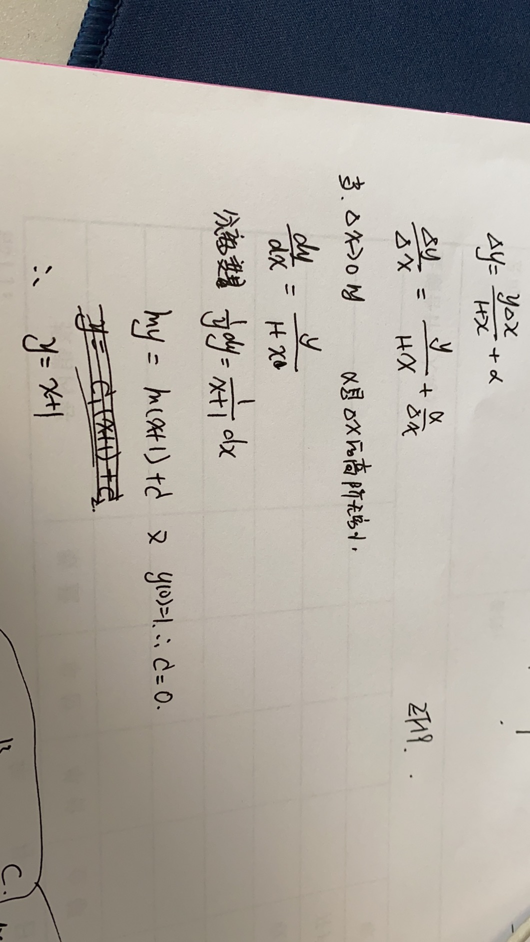 设y=y(x)在[0,+∞)可导,在任意x∈(0,+∞)处的增量△y=y(x+△x)-y(x)满足△y(1+△y)=y△x/(1+x) + α,其中α是当△x→0时是与△x等价的无穷小,又y(0)=1,则y(x)=