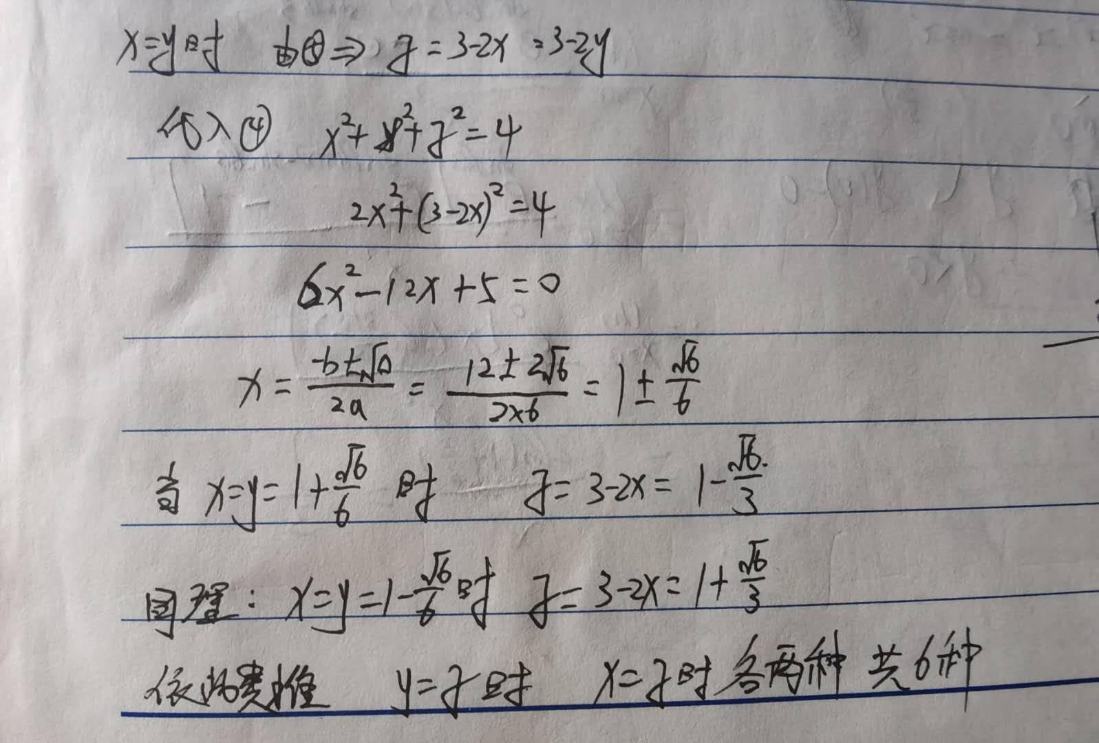 由题目可以看出x,y,z三者地位相同,但受到方程4,5的影响所以不可能是三者相等只能是两两相等。故如下计算:
