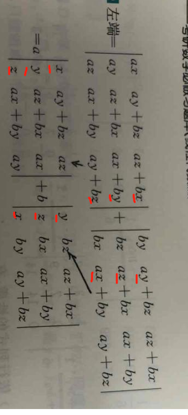 这步分解完不应该是四个行列式之和吗,(画箭头的)