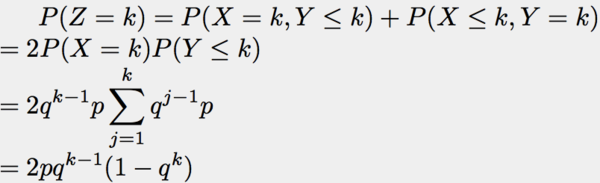 设随机变量X与Y均服从同一几何分布,且X与Y相互独立,P{X=k}=pq^(k-1)(k=1,2,3...),p+q=1,求Z=max{X,Y}的分布律