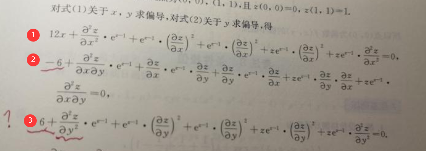 这三个应该是分别求导的结果呀,第三个式子是对上面的(2),对y求导得来的吧