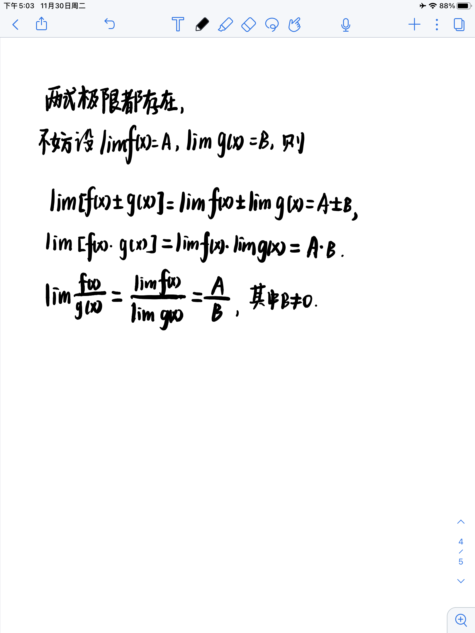 如果两式的极限存在,则该设问成立。这是极限的四则运算法则的内容,如下图所示: