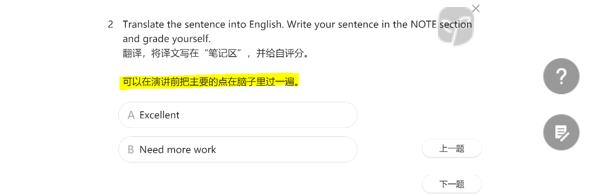 第2个习题中要求翻译,翻译哪一段?Translate the sentence into English. Write your sentence in the NOTE section and grade yourself。