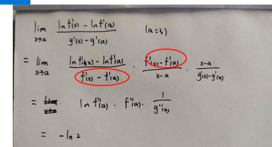 画圈是多余的,lnf'(x)是映射,x是自变量,用导数定义直接给分母除x-a即可