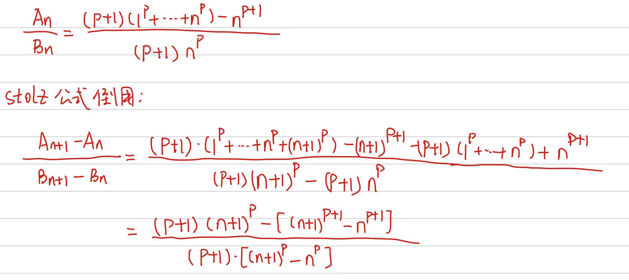 老师,这个三我只会用梯形法则做,他这个施笃兹定理,是怎么凑的,这个到第二步,它是咋变的呀,我真没看出来,而且最后一步,它整体提n的p次幂,之后,怎么有的项变p+1了呢