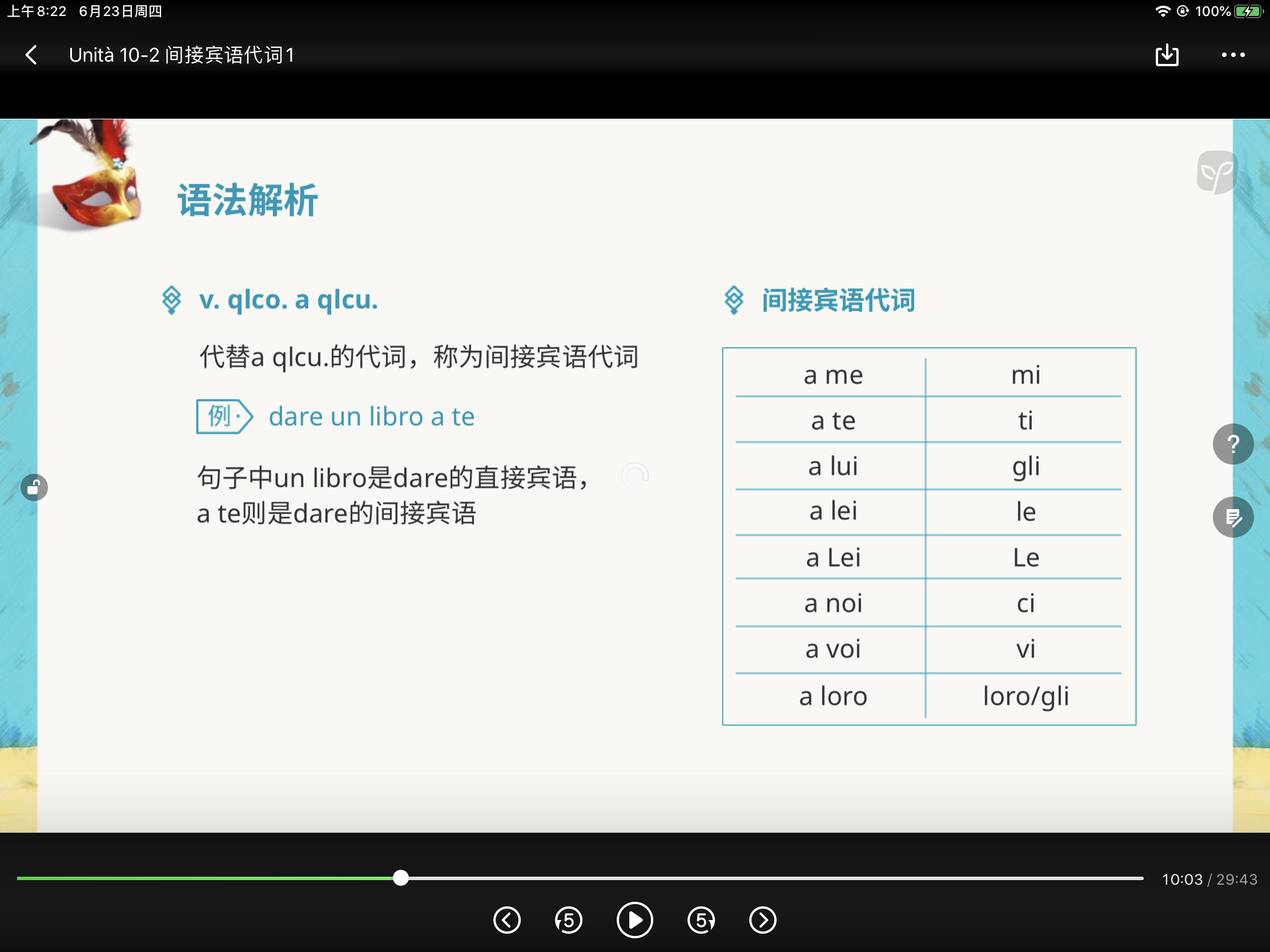 同学你好,该知识点来自沪江网校《意大利语(0-B2)零起点至高级【双11专享班】》的课程,想要更系统的学习,欢迎进入课程学习。不仅可以和更多的同学一起学习,而且还有老师、助教随时的学习指导和知识点解答哦。