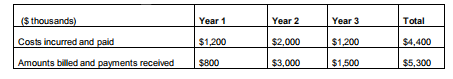 A company that uses International Financial Reporting Standards (IFRS) entered into a three-year construction project with a total contract price (all figures in thousands) of $5,300 and expected costs of $4,400. At inception, the outcome of the contract could not be reliably measured, but the company did expect to recover its costs. Actual results are shown in the following table: