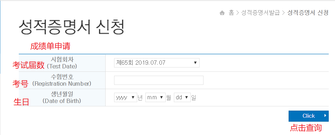 3.进入成绩单申请页面之后,输入相关信息,点击右下角的“Click”查询。