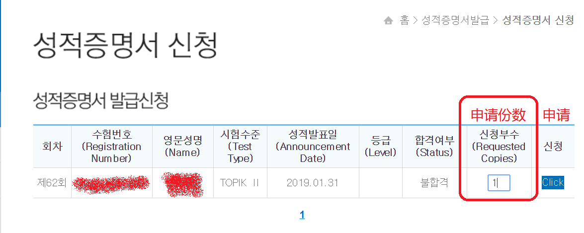 4.输入신청부수(申请数量)并点击“Click”申请。